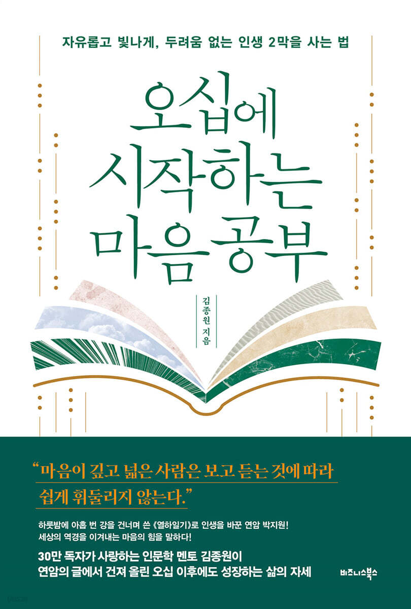 오십이라는 나이는 마음의 체력을 키워야 할 때입니다. 연암 박지원처럼 나이를 장애물이 아닌 도약대로 삼아 후회, 불안, 두려움을 버리고 가장 빛나는 오십으로 살아보세요. 꾸준한 배움, 밝은 안목, 말의 내공, 지적 판단력, 단단한 내면을 키워 나가면 빛나는 오십으로의 여정을 시작할 수 있습니다. 지금부터라도 늦지 않았습니다. 마음의 힘을 키워 원하는 모습으로 살아보세요.